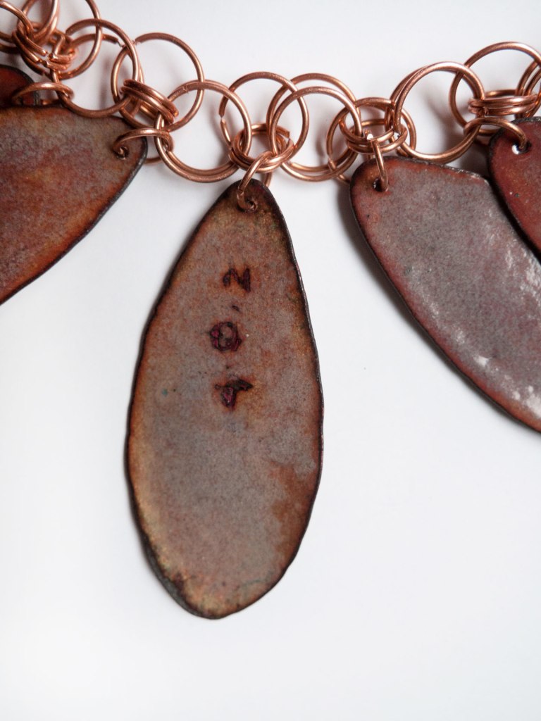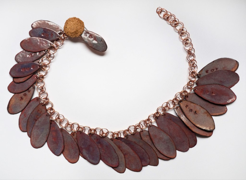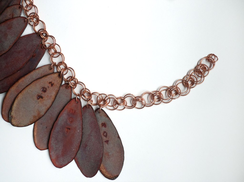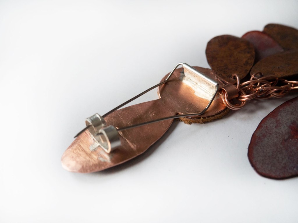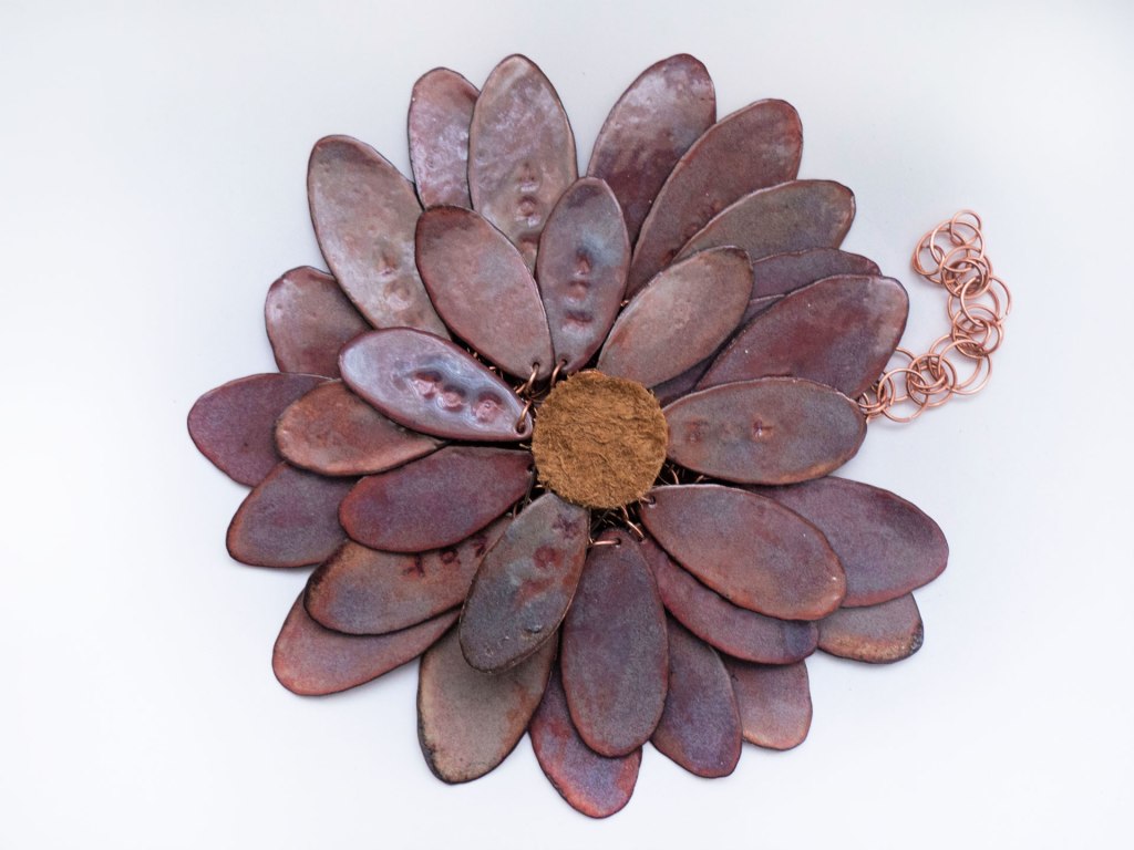 Love(s) me (not), enameled copper, recycled leather, silver, steel wire, 2023